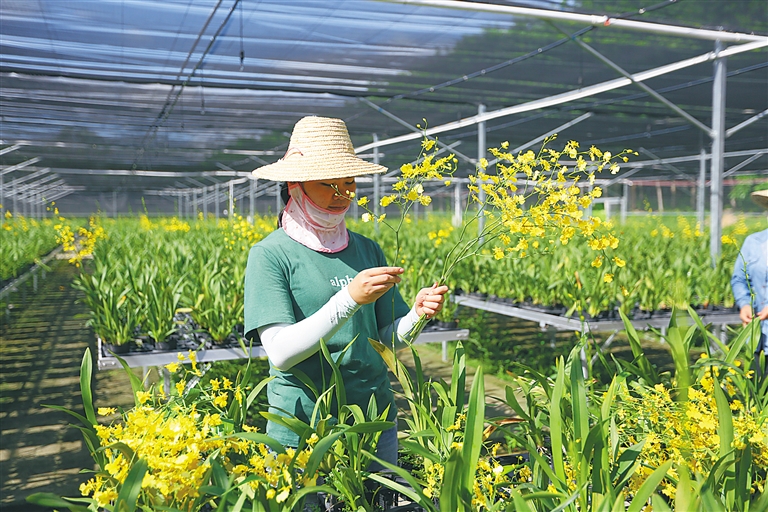 3月29日,白沙打安镇打安村的兰花产业扶贫基地,一株株姿态素雅的兰花竞相绽放,种植大棚里花香四溢,脱贫群众符惠芬和其他工友忙着给兰花添加叶面肥或颗粒肥。