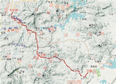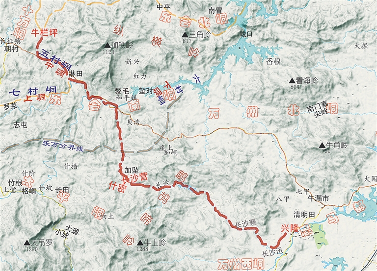 一由万州之兴隆、五甲西北行,经长沙营、什密、禁会、南峒、七村,出五指山之东,亦抵牛栏坪。