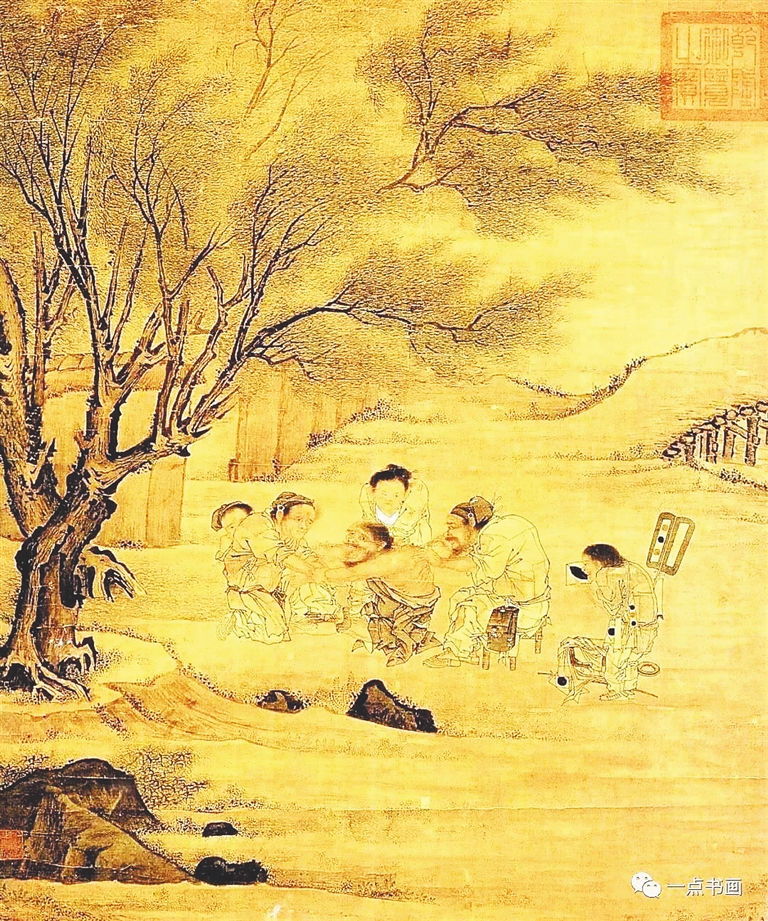 宋代李唐笔下的《灸艾图》,描绘了走方郎中(即“村医”)为贫苦百姓医治疾病的情形,因此又称《村医图》。画面中是聚集一起的六个人,笔墨清淡,远望去,一座小木桥架在清冽的溪水上,村舍土墙、粗壮荫翳的大树、树根周围的几块石头与几丛花草。画里的农村静谧、安宁,一切都显得寻常,普通的时间和司空见惯的地点,事件在真实地发生,这种平静更凸显了画中人紧张的治疗情节。