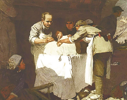 宋韧、肖峰这对艺术伉俪合作于1973至1974年间的油画《白求恩》,刻画白求恩在战地手术时的镇定、果敢、沉着、智慧,同样成就了美术史上的经典。当时他们正经历着一段特殊的病房生活,对医者的仁爱精神感激不尽,对医护专业也较为熟悉。画中很多细节都颇为讲究,例如描摹白求恩的手术姿势相当内行,白求恩当年亲自用木头制作的适用于敌后游击战的“手术鞍”也被搬上了画面。这幅《白求恩》问世后,被印成挂图、美术图片、年画、中小学生教科书插图等,影响十分广泛。