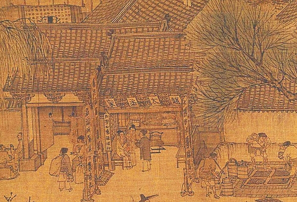 在《清明上河图》中,至少有3家挂着广告招牌的药铺。如在后段末尾挂着横额的“赵太丞家”药铺前,两个妇人抱着一个孩子去看病,一个医生正在诊察孩子病情。在“赵太丞家”药铺两侧还挂有“五劳七伤”、“治酒所伤真方集香丸”的竖额文告牌,这些药铺“几乎各科都有专门的医生,各铺各出卖其专门的专长的丸散等药。”“太丞”是宋代医生的官职称号。宋代除“赵太丞”外,还有“孙太丞”和“能太丞”等称号。《清明上河图》中这家“赵太丞家” 药铺,其建筑起码可分为三进院,即门屋与倒座为一进,倒座与相向建筑为一进,从右部厢房排列情况看,其后还应有一进院落和门屋与倒座相连。有两座作勾连搭式连接的店铺,店铺檐下之五攒五铺作斗拱, 则构成了他特有的“六品” 以上官僚的建筑标志。再加上店铺前面临街,作为营业部分,这种把建筑轴线指向交通要道的朝向处理,可首先争得顾客,无疑是一种符合经营规律的建筑布局方式。