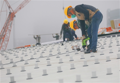 与此同时,在南馆的顶部,十余名工人正在进行着屋面防水的施工。“二期项目的屋面板有5层,每一层都分别具有吸音、防水、装饰等作用,目前施工已经完成了90%,预计4月中旬可以结束屋面板施工。”海南国际会展中心二期项目负责人施志全介绍。
