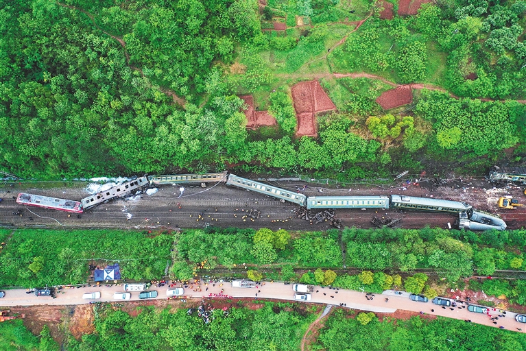 记者在现场看到,猛烈的撞击导致列车机车头变形偏离轨道,多节车厢倾覆;有的车厢受损严重,被折成“V”字形。