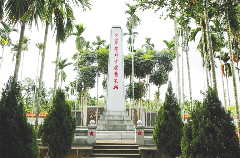 这是一座始建于1957年的纪念园。穿过婆娑的椰影,拾级而上,迎面就是总高10米的大水战斗革命烈士纪念碑(以下简称纪念碑)。纪念碑坐北朝南,呈梯形方体,“革命烈士永垂不朽”八个红色大字刚劲有力。