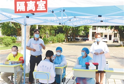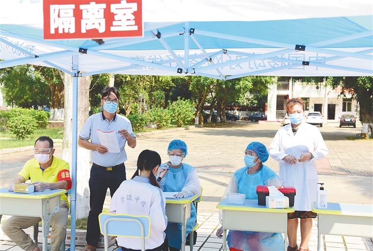 海南日报记者在现场看到,在红光学校篮球场上,校方利用遮阳帐篷搭建应急防控指挥部、模拟教室、隔离观察室、校长室、学校后勤处、卫生院等8个模拟场所。校领导、教师、学生、医务人员等佩戴口罩,在指定地点就位,参演人员跟随场景切换及旁白指令做出下一步反应。
