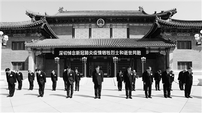 中南海怀仁堂前气氛庄严肃穆,门楣上悬挂着黑底白字横幅“深切悼念新冠肺炎疫情牺牲烈士和逝世同胞”。习近平等佩戴白花,来到这里,神情凝重面向国旗肃立。