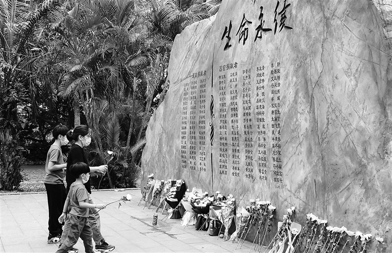 近年来,海南各地鼓励采用敬献鲜花、踏青遥祭、网络祭祀、社区公祭等方式表达对逝者的哀悼,文明祭祀的风尚已经形成。图为4月4日,在位于海口金牛岭公园的海南省遗体器官捐献者纪念园内,市民带孩子以鲜花敬献遗体器官捐献者。