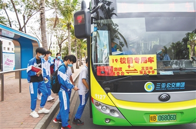 4月7日,三亚市第五中学学生正搭乘校园专用车上学,该市共投放100辆“校园专用车”点对点接送师生,共覆盖43所学校。 本报记者 武威 摄