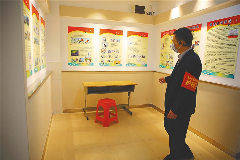 4月7日,开学首日的海口市玉沙实验学校工作人员检查隔离室。