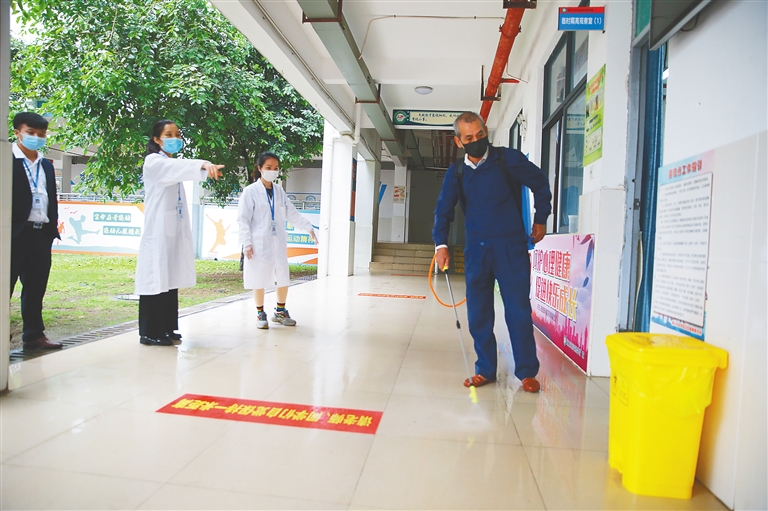 4月7日,在海口市玉沙实验学校,工作人员在专业人士指导下开展校园消杀。