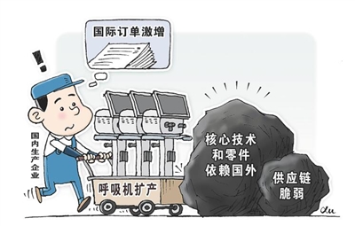 尽管手握大量国际订单,但业内人士表示,呼吸机增容扩产并不容易。不容回避的事实是,由于产业起步晚,呼吸机核心技术和关键元器件仍掌握在国外厂商手中。因部分零部件来自目前疫情严重的欧洲和美国,物流受阻,供应链脆弱。
