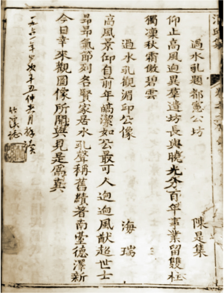 2017年我省在进行全国古籍普查时,发现文昌市图书馆珍藏的古籍——清道光年辛丑 (1841) 琼州府文昌邢氏宗祠刻本《湄丘集》附录卷有明海瑞撰七言律诗《过水吼观湄丘公像》一首,全诗如下: