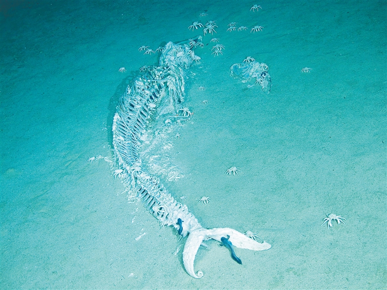 海南日报记者从中山大学海洋科学学院官方网站了解到,在北太平洋深海中,至少有43个种类、12490个生物体依靠鲸落生存。