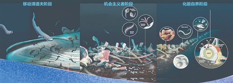 鲸的尸体分解的三个阶段,支持着从大鲨鱼到微小细菌等生物群落的演替。这也是鲸落被认为是维持深海生命和生态的驱动性食物来源的原因。