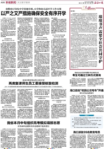 海南日报 本省新闻 关注复学复课 006 2020-04-101 2020年04月10日 星期五