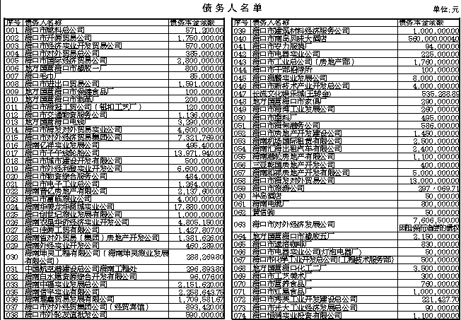 现公告通知下列未能及时履行还款义务的债务人、担保人,请在本公告刊登之日起10天内,向海口信托投资公司清算组履行相关合同约定的还本付息义务及相应的担保责任(若债务人、担保人因各种原因更名、改制、歇业、吊销营业执照或丧失民事主体资格的,请相关承债主体或主管部门代为履行或履行清算责任,承债主体或主管部门应承担本金及至实际还款日期间应付未付利息的偿还义务)。公告金额为截止2020年3月30日的本金余额,未含利息;应付未付利息按合同约定或中国人民银行有关贷款利息规定计算。 另请持有海口市信托投资公司财产的个人或单位在本公告刊登之日起10天内向海口市信托投资公司清算组移交财产。特此公告。