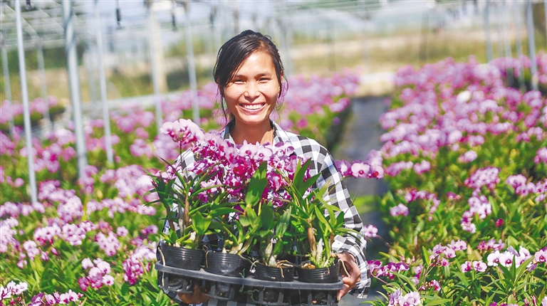 | 在东方市迦南兰花种植农民专业合作社,社员们正在花棚里培育兰花。该合作社加大扶贫力度,让贫困户转型升级为技术农民,实现就业增收双收益。