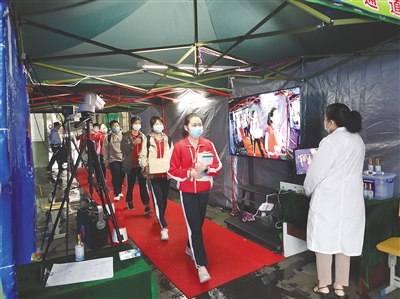 开学后,儋州市第二中学初三年级学生有序通过体温检测。通讯员 羊文彪 摄