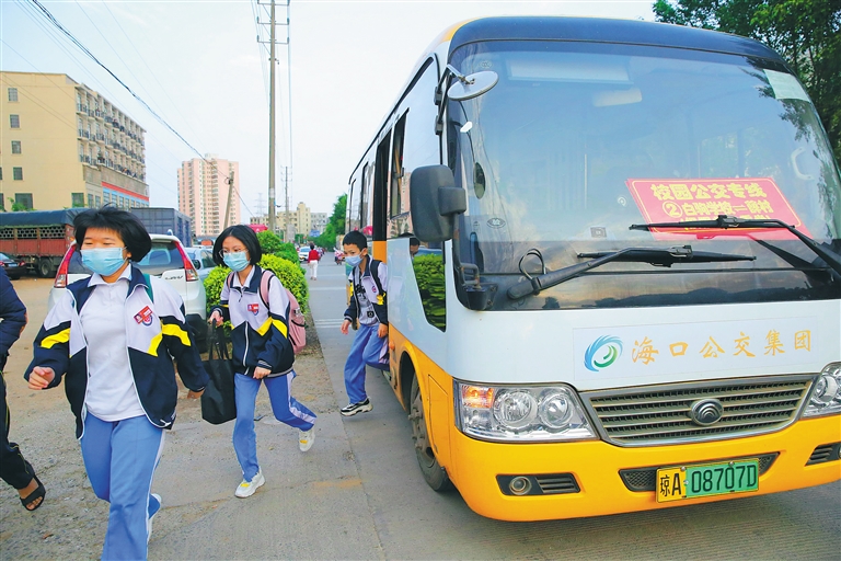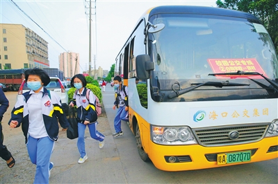② 4月13日,海口开通首批“校园公交专线”,载着白驹学校的学生直达学校。本报记者 张茂 摄