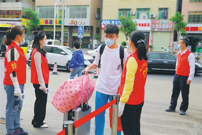 ③ 4月13日,在海南中学高中部,负责接送学生的家长即落即走,该校组织志愿者,帮前来报到的学生运送行李到宿舍、测量体温等。本报记者 张茂 摄