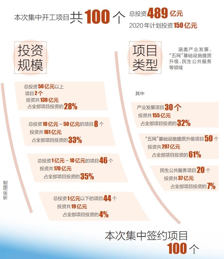 本次集中开工项目共100个,总投资489亿元,2020年计划投资150亿元。这些项目,既有为贯彻落实党中央、国务院决策部署、建设自由贸易港而签约落地的中国大唐国际贸易中心等重大项目,也有结合海南实际推进三大主导产业发展、“五网”基础设施提质升级而谋划开工的文昌航天超算大数据产业集群、迈湾水利枢纽等高质量项目。