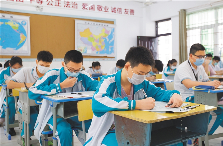 4月8日,在海南中学三亚学校,初三年级的学生正在进行摸底考试,考察前一阶段网络课堂的教学成果,备战中考。