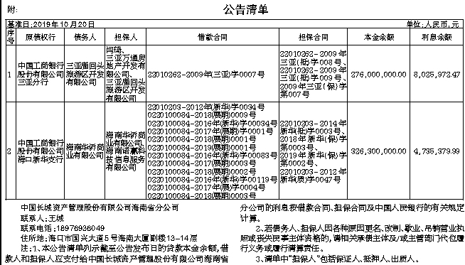 根据中国工商银行股份有限公司与中国长城资产管理股份有限公司海南省分公司签署的《资产转让协议》[编号:工银2020年003号资产包(海南地区资产)],中国工商银行股份有限公司海南省分行(含各分支行)已将其对下列债务人及其担保人享有的主债权及担保合同及其他法律文件项下的全部权利依法转让给中国长城资产管理股份有限公司海南省分公司。中国工商银行股份有限公司海南省分行与中国长城资产管理股份有限公司海南省分公司联合公告通知各债务人及担保人以及其他相关各方。 中国长城资产管理股份有限公司海南省分公司作为上述债权的受让方,现公告要求下列债务人及其担保人,从公告之日起立即向中国长城资产管理股份有限公司海南省分公司履行主债权合同及担保合同等法律文件约定的偿付义务或相应的担保责任。