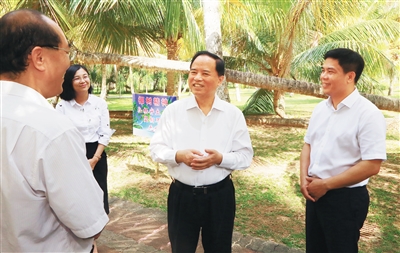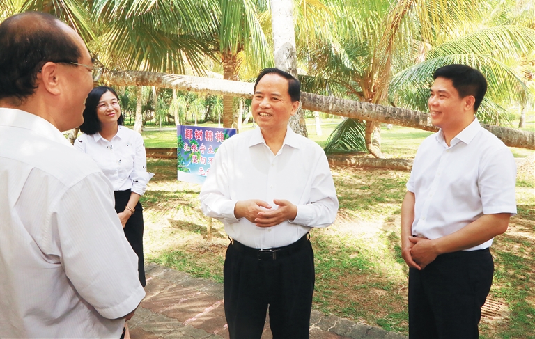 热科院文昌椰子研究所保存了160多种椰树种质资源,刘赐贵走进椰子研究所里的椰子大观园,了解种质研究、良种推广、加工利用和椰子产业发展情况,并与市民游客交流。他说,椰树是海南的省树,椰树身上体现的扎根守土、坚韧不拔、无私奉献,正是自贸港建设所需要的精神特质,要大力宣传弘扬,使每个人身上都闪现椰树精神的光芒,齐心协力加快推进自贸港建设。
