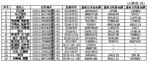 截止至债权转让之日,我司将上述许云涛等15户所剩余本金及其相应的利息,诉讼费、律师费、公告费、执行中所产生的评估、开锁费等已产生或未来可能产生的费用,还包括执行罚息等相关权益。转让给海南骏企壹号商业服务中心(有限合伙)-执行事务合伙人:海南大亿信息咨询有限公司(委托代表:许胜)。特此公告。