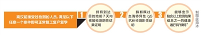 根据通知,对于离汉前接受过检测的人员,到达目的地后,满足以下任意一个条件即可正常复工复产复学:一是持有到达目的地前7天内核酸检测阴性结果证明;二是持有既往血清特异性IgG抗体检测阳性证明;三是能够出示包含以上检测结果信息之一的健康通行码“绿码”。