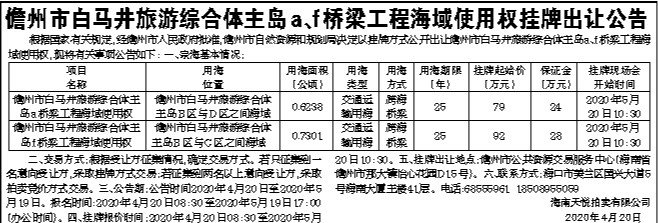 儋州市白马井旅游综合体主岛a、f桥梁工程海域使用权挂牌出让公告