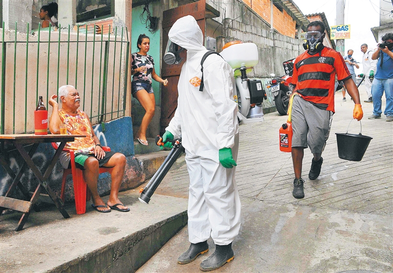 一名志愿者在里约热内卢一处贫民窟消毒。