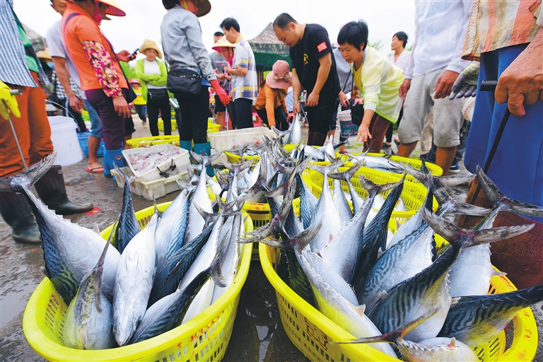 4月18日,琼海市潭门港的渔民在码头装卸海鱼。春暖花开时节,渔民海上捕捞亦有好收成。每天清晨,大批满载而归的渔船返回潭门港卸货,码头上人来车往,一派繁忙。特约记者 蒙钟德 摄