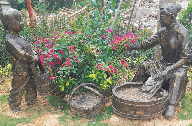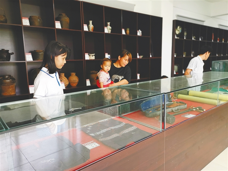 在民俗民情馆里,展出着数百件村民生产生活的老物件。石磨、石臼、陶罐、陶碗、木犁、扇车、民族服饰等展示着儋州地区过去的农耕历史文化。带女儿来参观的白地村民小组村民符兰花说:“要让孩子知道传统民俗民情,珍惜新时代、新生活。”