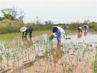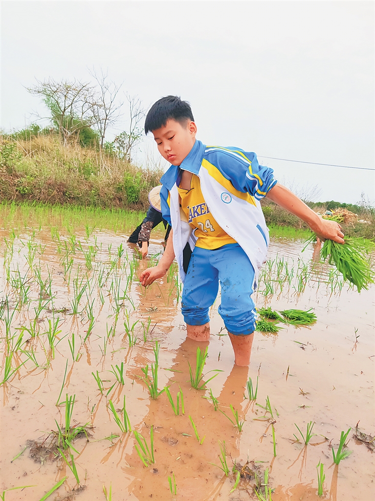 近日,儋州市白马井镇藤根小学五年级学生李海源在父亲的带领下,回到老家王五镇利根村参加春耕,这是他第一次在稻田里学习插秧。