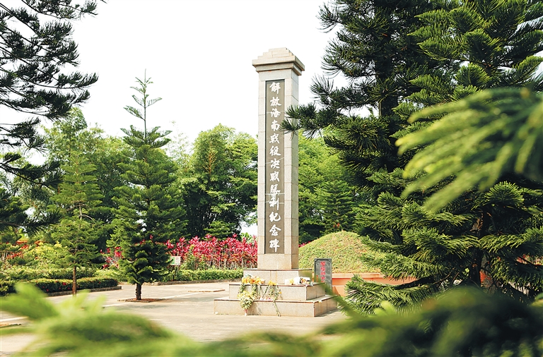 在公路旁一片松柏环绕的静穆之地,一座纪念碑矗立其中,碑的正面自上而下镌刻着13个遒劲的大字——“解放海南战役决战胜利纪念碑”。纪念碑后面,镌刻着美亭决战的简介。