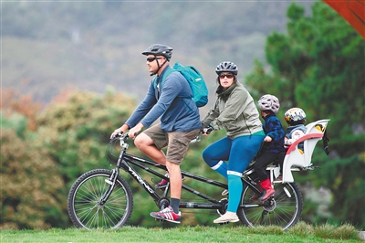 4月20日,在新西兰惠灵顿市郊,一家四口骑车出行。