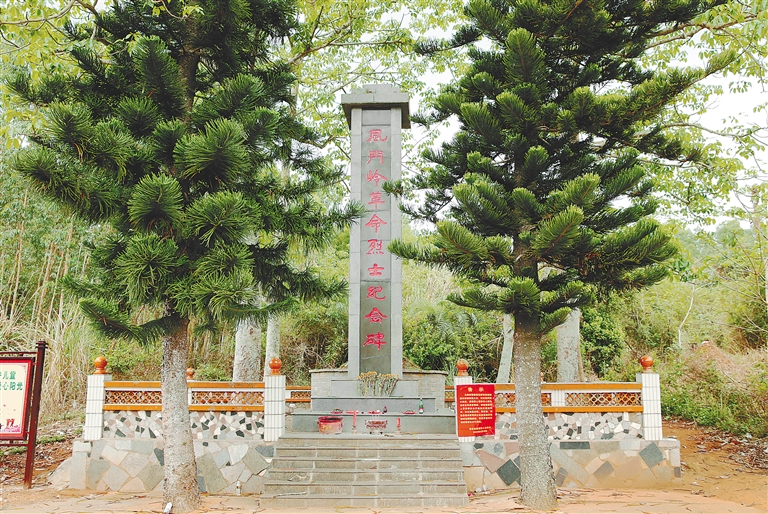 在澄迈县老城镇潭城村北约1公里的坡地,风门岭革命烈士纪念碑面朝一片松林,纪念碑的后面是烈士的土墓。这里是美亭决战中的一场规模不大,但无比艰苦的战斗——风门岭阻击战所在地。