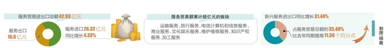新兴服务(扣除运输、旅行、建筑、政府采购、加工的其他服务)进出口同比增长31.44%,占服务贸易总额的35.49%,比去年同期提高11.39个百分点。其中商业服务、电信计算机和信息服务、维修服务、文化娱乐服务进出口占服贸总额比重较去年同期分别增长10.72%、4.2%、2.37%和1.91%。
