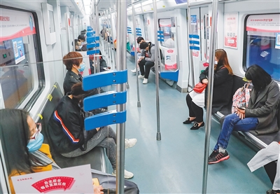 4月22日,在武汉轨道交通一号线上,乘客间隔一定距离坐在车厢里。据了解,从4月22日起,武汉城市公共交通有序恢复全线网运营。新华社发