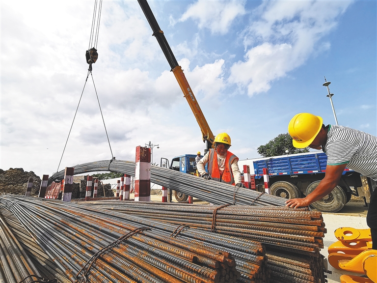 “靠右,轻些放。”在一处钢筋加工区,三四名工人正在搭建加工棚,棚区边上一辆吊车正缓缓放下一大摞钢筋,中铁建设集团生产副经理王红山一边指挥工人码放钢筋,一边监督工人搭建棚屋。这些钢筋是项目下一步主体施工需要用到的材料,现在已提前进场。
