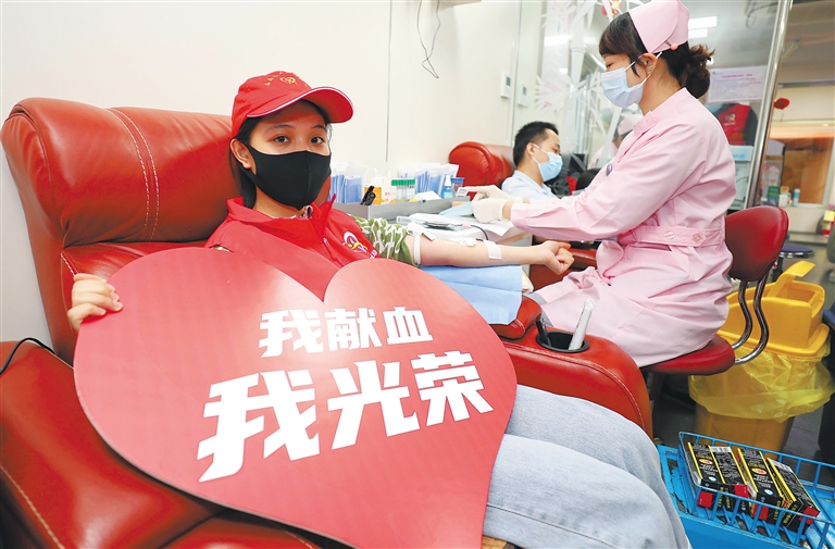 4月25日,在海口市美兰区明珠广场献血屋,10多名志愿者集体献血。