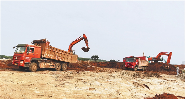4月27日,位于洋浦经济开发区腾洋路旁的杭萧钢构洋浦智能建筑出口加工项目工地,10多台挖掘机挥舞巨臂、10辆自卸车来回穿梭运送土石,20个点同时开挖土石。“前天洋浦大雨,湿土无法填埋低洼地,自卸车轮胎在湿泥地打滑,延误2天工期。今天能够开展土方挖填施工了,我们多个点同时开挖填埋土石,工地周边没有居民,可24小时连夜施工,马上就能抢回延误的工期。”负责项目施工的湖南省第六工程有限公司项目执行经理吴登说,“制定交叉施工、提前进场准备等超常规措施,加快项目建设速度,在保证安全和质量的前提下,将提前50天,在100天内建成1号厂房,完成投资3亿元,实现产品下线。”