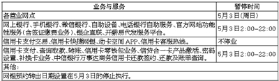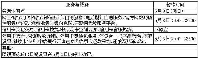 我行将于2020年5月3日进行核心业务系统升级,受此影响,将暂停部分业务和服务,请您提前做好资金安排。暂停营业期间给您造成的不变,敬请谅解。