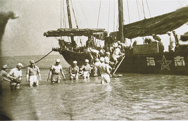 从一些珍贵的野战军登岛历史影像中,我们可以看到,距离海岸线还有约150米时,我方指战员就争先恐后地跳下木帆船,跃入齐腰深的海水里,踏浪登岛。