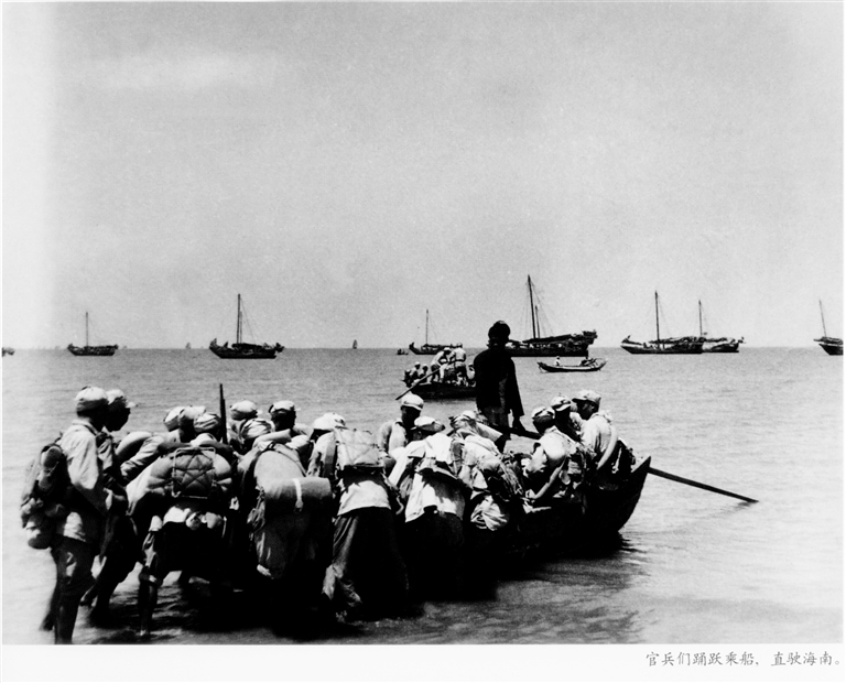在2000年出版的《碧血琼崖照千秋》画册里,有一张老照片会让人停下翻页的手指,凝视良久,感慨颇多。照片里,十余名解放军指战员斗志昂扬,挤在一条小小的木舟上,向着不远处的木帆船进发。
