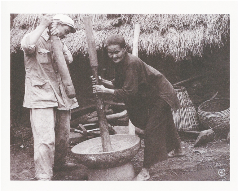 1950年4月16日,解放军主力乘夜启航,17日凌晨,部队在海口以西至临高角地段突击登岛。从一张老旧的黑白照片中可以看到,一名登陆海南岛的解放军战士借老乡的舂米器具,自己动手舂米,动作颇为生疏。这张照片拍摄于1950年4月17日临高县城附近的渡头村,一位老大娘主动帮助一名小战士舂米。