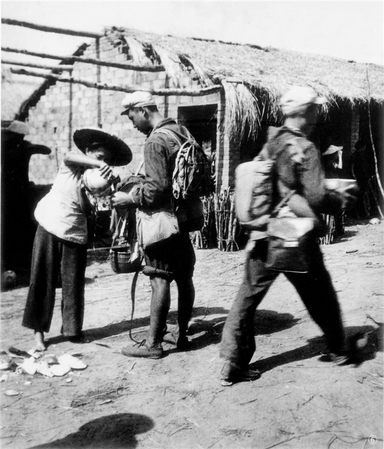 图片上,一位解放军战士穿着褶皱的旧军装,背着简易的行军袋,海南炎热的天气让他顾不得蚊虫的叮咬,高高挽起了裤腿。他身后是步履匆匆的战友,面前却是一位头戴斗笠的老大妈,手正好挡住了脸,看不清面容,但地上刚剁下的椰棕和她手中端着的椰子,可以看出老大妈正倒出新鲜的椰子水,给行军途中的解放军战士解渴。