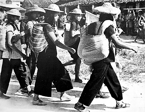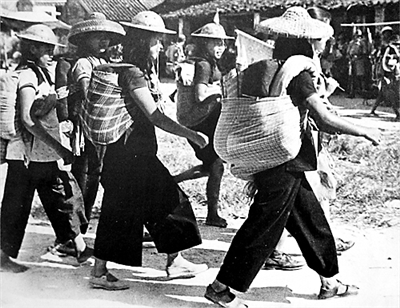 “黄昏的时候,我们进到海文公路上的云龙市。街上挤满了队伍,中间夹杂着很多群众,一群一群的妇女都担着水桶。”40军随军记者周明在《海南岛解放战役片断》中记录了妇女担水队的情况。原来解放军在山区路上很难找到干净的水源,于是当地的妇女自发组成担水队从几公里外挑水回来给战士们喝。