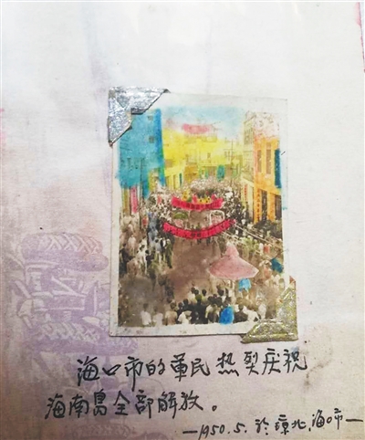 “在父亲的遗物中,我看到过这张照片。”接受海南日报记者电话采访时,62岁的寇金刚忍不住哽咽了,他告诉记者,父亲已于1969年去世,当时他只有11岁,被寄养在爷爷奶奶家。在父亲留下的遗物中,他发现了几个作品集笔记本,其中一本就贴有这张照片。照片的下面,用黑色钢笔写着一行字: 海口市的军民热烈庆祝海南岛全部解放。——1950.5。于琼北,海口。